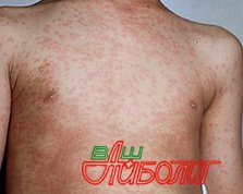 - Появлением пятнисто-папулезной сыпи. Первые элементы сыпи появляются за ушами, на спинке носа имеют вид мелких розовых пятен, которые очень быстро увеличиваются, иногда сливаются, имеют неправильную форму.