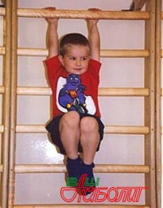 Ставим скамейку, четыре обруча (друг за другом), две скакалки привязываем на небольшую высоту, создавая имитацию бревна, которое надо перешагнуть, и перелезть под вторым«бревном». На скамейке при ожирении ребенка можно: ходить, руки в стороны; ползти, подтягивая себя руками; ползти, сидя, спиной вперёд, смотреть через правое плечо; ползти, сидя, правым, потом левым боком. В обручах изучаем прыжки при ожирении ребенка на двух ногах, на одной попеременно. На всех препятствиях родители должны страховать детей.
