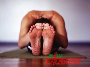 13. И.п. - сидя на полу, вытянув ноги. Развести их в стороны как можно шире, взяться правой рукой за внешнее ребро правой стопы, развернуть корпус параллельно правой ноге, слегка согнув ее в колене. Поместить ладонь левой руки чуть выше колена правой ноги и давить на это место на семь счетов. Со временем нога расслабится, но давить продолжать. Все это время тянуть носок правой ноги на себя. Язык при этом находится в Точке воздуха (Вайю-набхи-мудра) над верхними зубами примерно на уровне середины верхней губы. Выполнять растяжку от одной минуты и дольше по самочувствию. Повторить то же в другую сторону. Потом то же, но для двух ног, при этом браться за внутреннее ребро стопы, затем захватывая стопу сверху. Если не достаете до стопы, можно держаться за лодыжку.