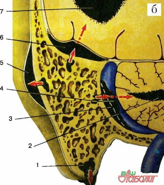 Хронический отит (в частности эпитимпанит) часто дает различные внутричерепные осложнения, каждый из которых, опасен по-своему. Венозная система черепа очень развита, а ее сосуды сообщаются между собой. Если изучить венозную структуру черепа, можно заметить, что существуют участки вен, которые расширены, и они называются синусами. Вблизи сосцевидного отростка и уха находятся сигмовидные и поперечные синусы, которые чаще всего вовлекаются в воспалительный процесс. Осложнение хронического отита флебит наступает в обострении хронического воспалительного процесса в сосцевидном отростке или в среднем ухе, в результате которого происходят деструкции костей.