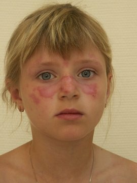 Системная красная волчанка у детей встречается не так уж и часто, может развиться в любом возрасте, но чаще всего в подростковом возрасте и в основном у девочек. Болезнь начинается остро с повышения температуры тела до 38-39 градусов. Общего недомогания. Затем присоединяются изменения со стороны кожи, и эти проявления бывают различными.